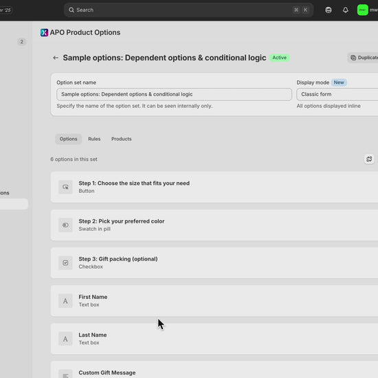 Rules let you control which options appear on the product page based on your customer’s previous selections: creating a clean, guided experience without overwhelming them with unnecessary choices.