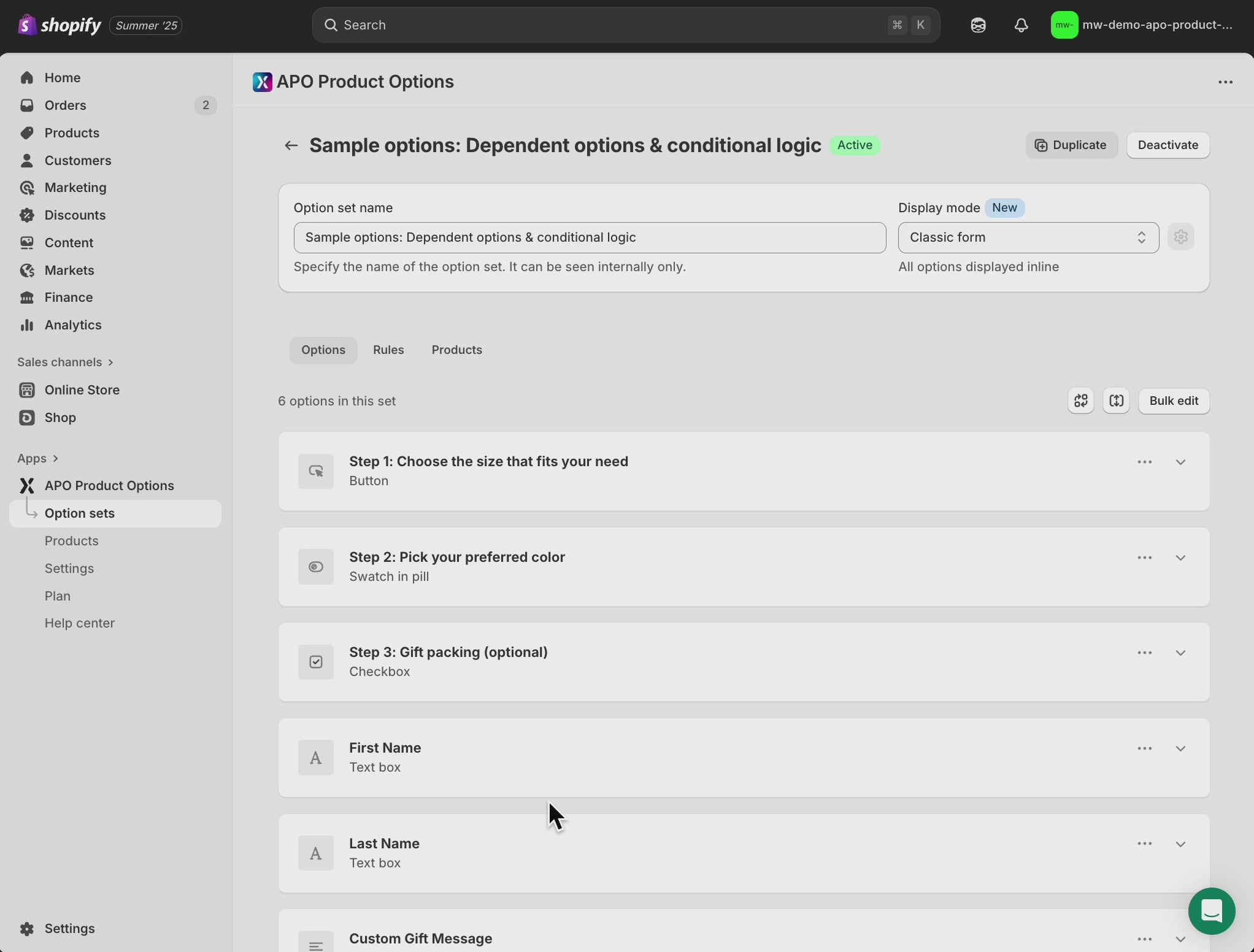 This is ideal for products with dependent options, such as personalized gifts, bundles, apparel, or configurable equipment. Try selecting different values in this demo to see how the logic works in real time.