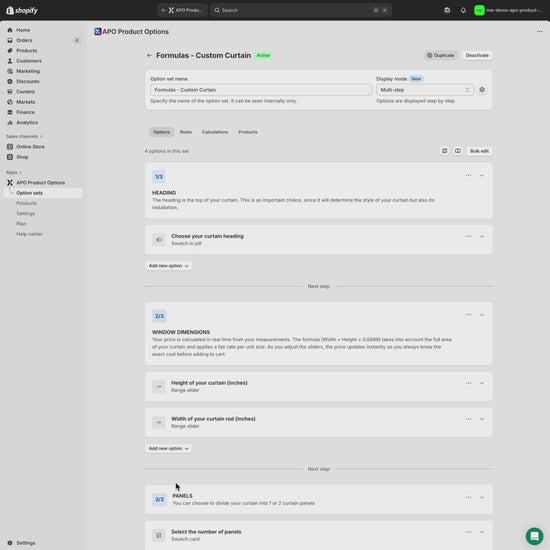 This product uses Formulas (on STEP 2: WINDOW DIMENSIONS) to calculate prices dynamically based on your selections.